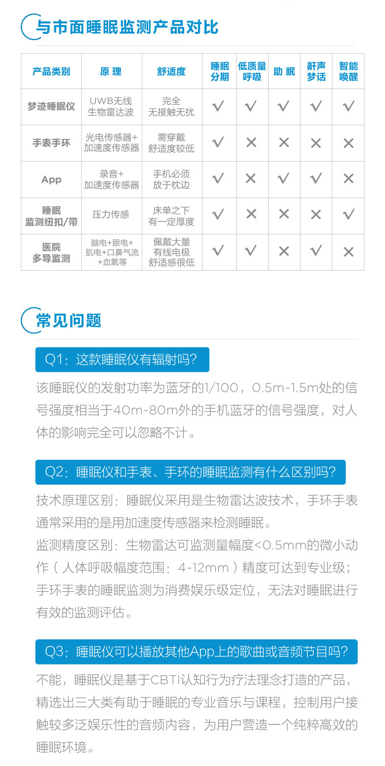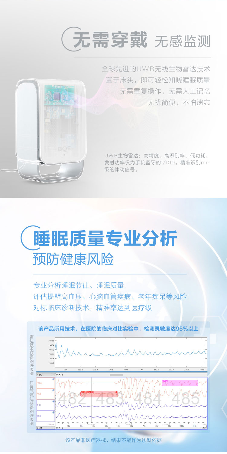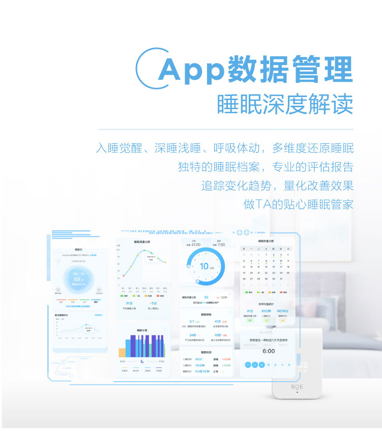 睡眠呼吸质量指数(RQI)、睡眠质量分数(SQI)、睡眠分期时长统计及比例、实时呼吸率、心率体动趋势、鼾声梦话