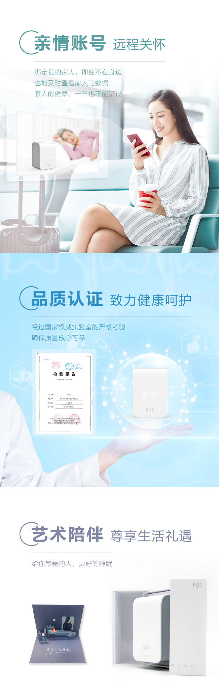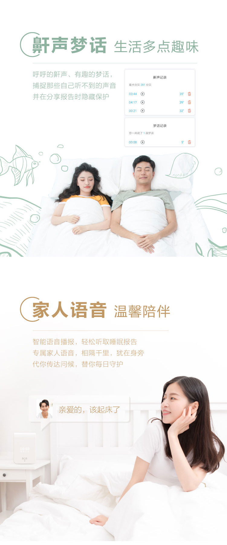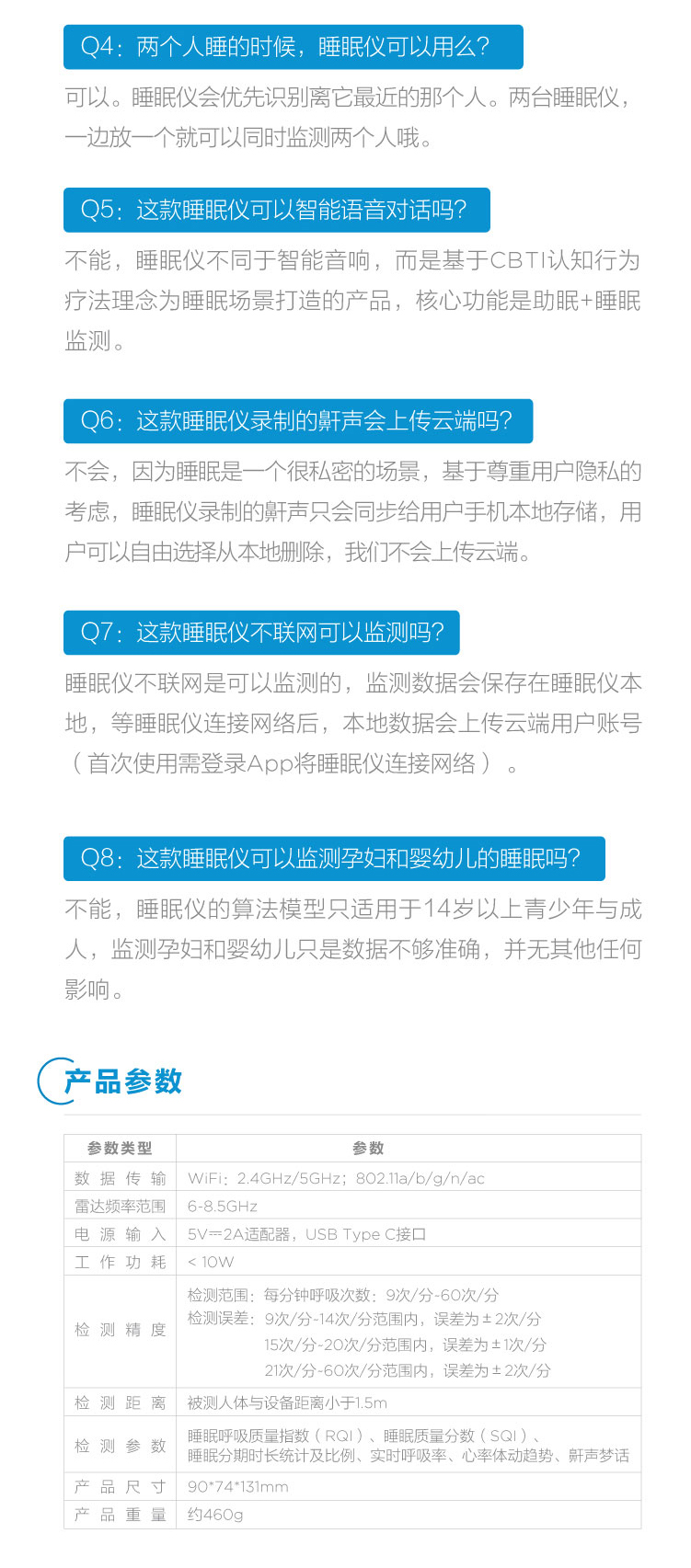 睡眠呼吸质量指数(RQI)、睡眠质量分数(SQI)、睡眠分期时长统计及比例、实时呼吸率、心率体动趋势、鼾声梦话