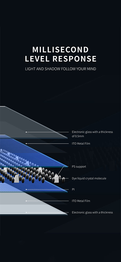 Dye liquid crystals with dichroic properties are injected between two layers of glass or plastic substrates coated with transparent conductive oxides to form a liquid crystal dimming functional layer, and the rotational angle of the liquid crystals and dye molecules can be adjusted by applying an AC voltage (<24V) to control the luminous flux of the window and realize the delicate control of the glass light transmittance.
